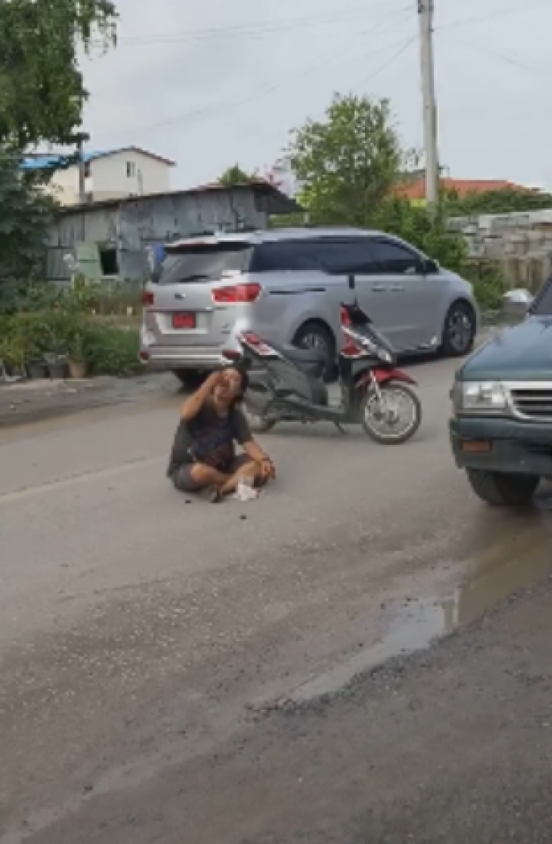 สุดงง หนุ่มนั่งกินข้าวกลางถนน รถผ่านมาต้องหลีกทางให้