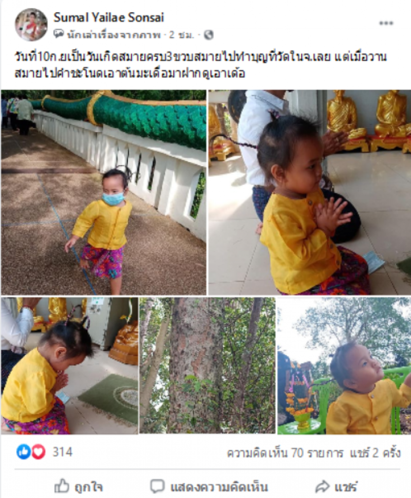 ล่าสุดเข้าอีกแล้วจ้า สำหรับเลขน้องสมายหลังมีผู้ใช้เฟสบุ๊คชื่อ Sumal Yailae Sonsai ได้ออกมาโพสต์ภาพพร้อมทั้งได้ระบุข้อความว่า วันที่10ก.ยเป็นวันเกิดสมายครบ3ขวบสมายไปทำบุญที่วัดในจ.เลย แต่เมื่อวานสมายไปคำชะโนดเอาต้นมะเดื่อมาฝากดูเอาเด้อ