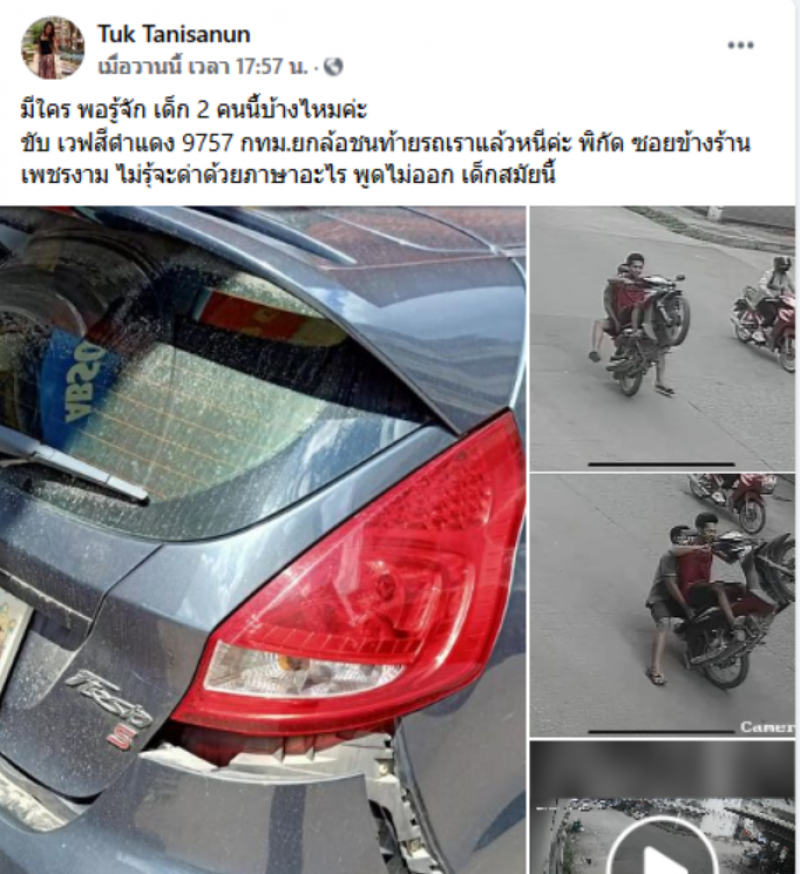 โดยผู้โพสต์ระบุว่า มีใครพอรู้จัก เด็ก 2 คนนี้บ้างไหมคะ ขับรถจยย. เวฟ สีดำแดง 9757 กทม. ยกล้อชนท้ายรถเราแล้วหนีค่ะ พิกัด ซอยข้างร้านเพชรงาม จ.นครปฐม ไม่รู้จะด่าด้วยภาษาอะไร พูดไม่ออกเด็กสมัยนี้