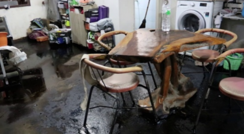 ภายในบ้านหลังดังกล่าว ซึ่งเปิดเป็นร้านขายของชำ พบบริเวณพื้นบ้านทั้งหมดตั้งแต่หน้าบ้านจนถึงห้องน้ำหลังบ้าน มีน้ำยางมะตอย สำหรับทำถนนลาดยาง ไหลเอ่อท่วมสูงกว่า 10 ซม ท่อระบายน้ำหลังบ้านถูกน้ำยางมะตอย ไปอุดตัน น้ำที่ไหลเข้าบ้านไม่สามารถระบายออกได้ทั้งระบบ