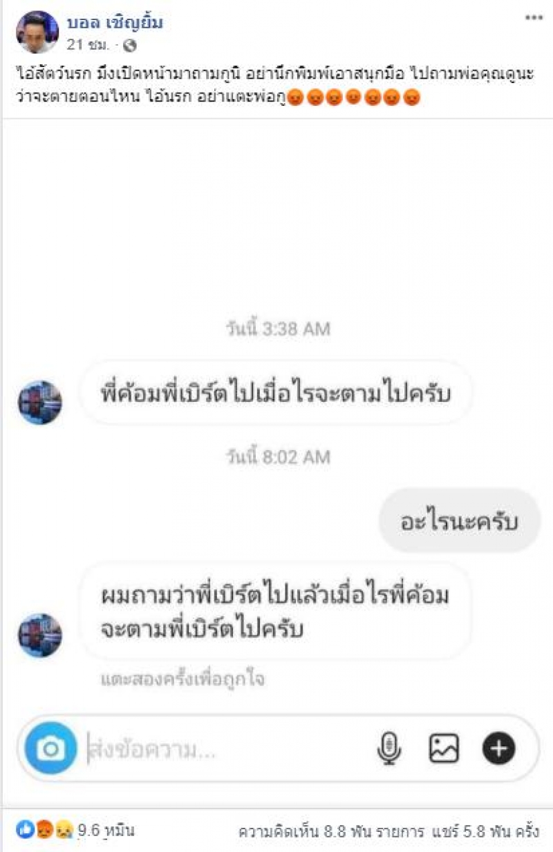 ทั้งนี้ ในเฟซบุ๊กของ บอล เชิญยิ้ม ก็ได้มีการแสดงความไม่พอใจ เนื่องจากรับไม่ได้กับเหตุการณ์ที่เกิดขึ้น โดยระบุข้อความเดือดว่า **** มึงเปิดหน้ามาถามกูนิ อย่านึกพิมพ์เอาสนุกมือ ไปถามพ่อคุณดูนะว่าจะตายตอนไหน **** อย่าแตะพ่อกู