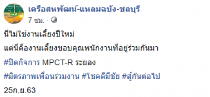 เมื่อวันที่ 25 กย 63 เพจ เครือสหพัฒน์ แหลมฉบัง ชลบุรี ได้โพสต์ข้อความระบุว่า นี่ไม่ใช่งานเลี้ยงปีใหม่ แต่นี่คืองานเลี้ยงขอบคุณพนักงานที่อยู่ร่วมกันมา ปิดกิจการ MPCT R ระยอง มิตรภาพเพื่อนร่วมงาน โชคดีมีชัย สู้กันต่อไป 25 ก.ย.63