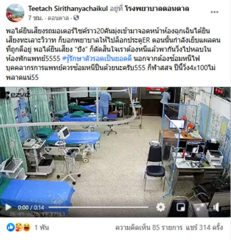 โดยผู้โพสต์ระบุว่า พอได้ยินเสียงรถมอเตอร์ไซค์ราว20คันมุ่งเข้ามาจอดหน้าห้องฉุกเฉินได้ยินเสียงทะเลาะวิวาท ก็บอกพยาบาลให้ไปล็อกประตูER ตอนนั้นกำลังเย็บแผลคนที่ถูกตีอยู่ พอได้ยินเสียง ปัง ก็ตัดสินใจเราต้องหนีแล้วพากันวิ่งไปหลบในห้องพักแพทย์5555 #รู้รักษาตัวรอดเป็นยอดดี นอกจากต้องซ้อมหนีไฟบุคคลากรการแพทย์ควรซ้อมหนีปืนด้วยนะครับ555 กีฬาสสจ ปีนี้วิ่ง4x100ไม่พลาดแน่55