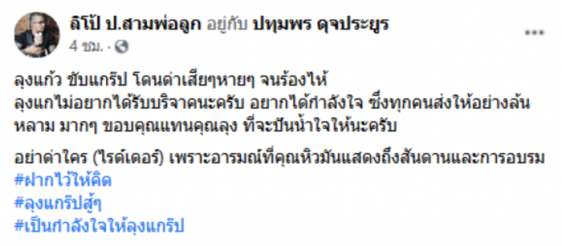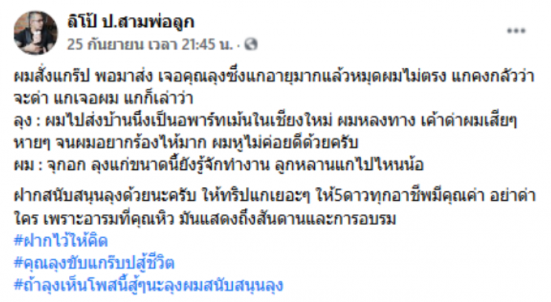 เรียกได้ว่าเป็นอีกหนึ่งเรื่องราว ที่ถูกวิพากษ์วิจารณ์อย่างมาก เมื่อหนุ่มคนหนึ่ง ได้โพสต์เรื่องราวลงในเฟซบุ๊ก หลังจากที่เรียกใช้บริการแกร็บฟู้ดผ่านคุณลุงท่านหนึ่ง แต่ทว่าหมุดพิกัดที่อยู่ของบ้านไม่ตรง ทำให้คุณลุงเป็นกังวล และได้เล่าเรื่องราวที่เคยเกิดขึ้นกับตนให้ฟัง ทำให้หนุ่มคนสั่งอาหารถึงพูดไม่ออก และสงสรคุณลุงเป็นอย่างมาก จึงได้โพสต์ลงในโซเชียล โดยระบุว่า