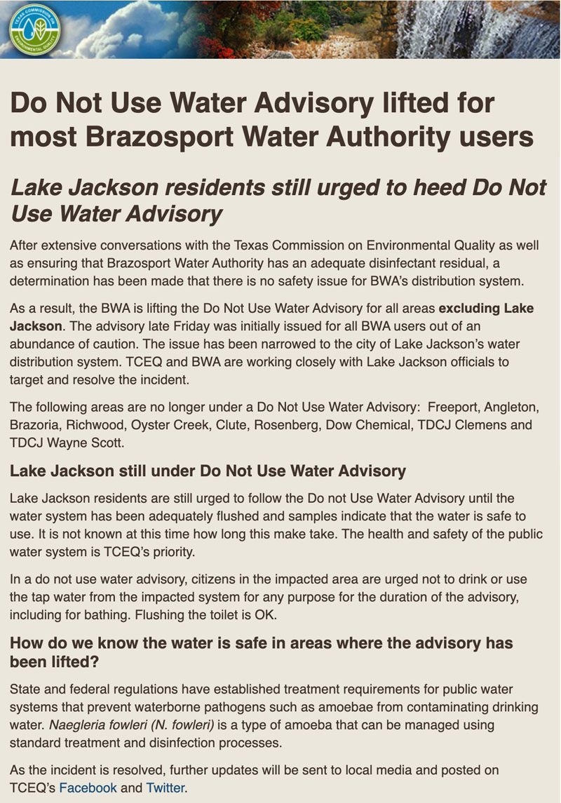 ยกเว้นเขตเลกแจ๊กสัน สามารถใช้และบริโภคได้แต่ต้องนำน้ำประปาไปต้มก่อน ขณะที่ศูนย์ควบคุมและป้องกันโรคแห่งชาติ (ซีดีซี) แถลงว่าโรคเยื่อหุ้มสมองอักเสบจากอะมีบาไม่ใช่โรคติดต่อ การติดเชื้อมักเกิดขึ้นจากการสำลักน้ำขณะว่ายหรืดดำน้ำ ส่วนการดื่มน้ำปนเปื้อนนั้นไม่ทำให้ติดเชื้อ และในสหรัฐมีอัตราการติดเชื้อต่ำ พบเพียง 34 คนในช่วง 9 ปี ระหว่างปี 2552-2561