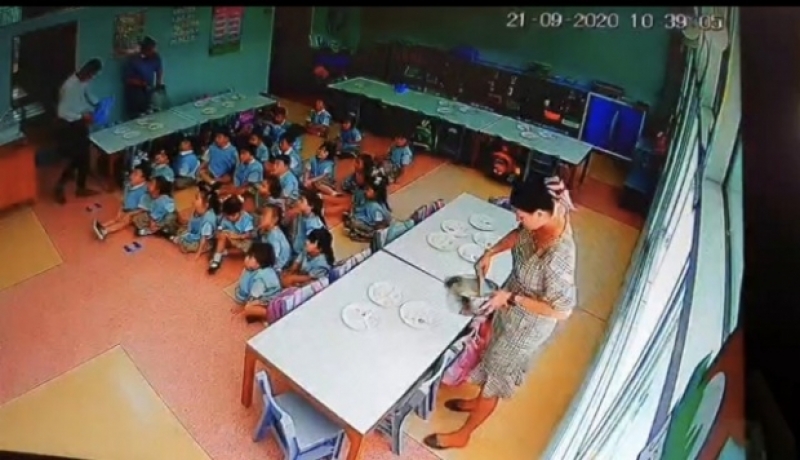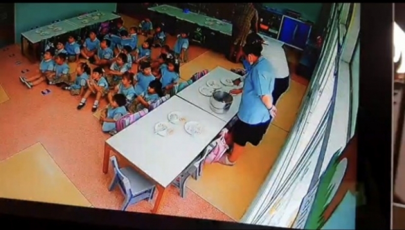 เป็นภาพที่กล้องวงจรปิดในห้องเรียนบันทึกไว้ในนาทีที่ 38 ซึ่งครูจุ๋มและครูในห้องกำลังช่วยกันตักอาหารใส่ถาดหลุมให้กับเด็กๆ จนถึงนาที 41 จากนั้นในนาทีที่ 43 เด็กๆในห้องเรียนจึงได้เริ่มรับประทานอาหารที่จัดวางไว้บนโต๊ะ