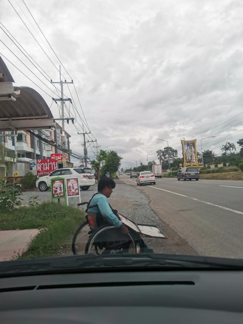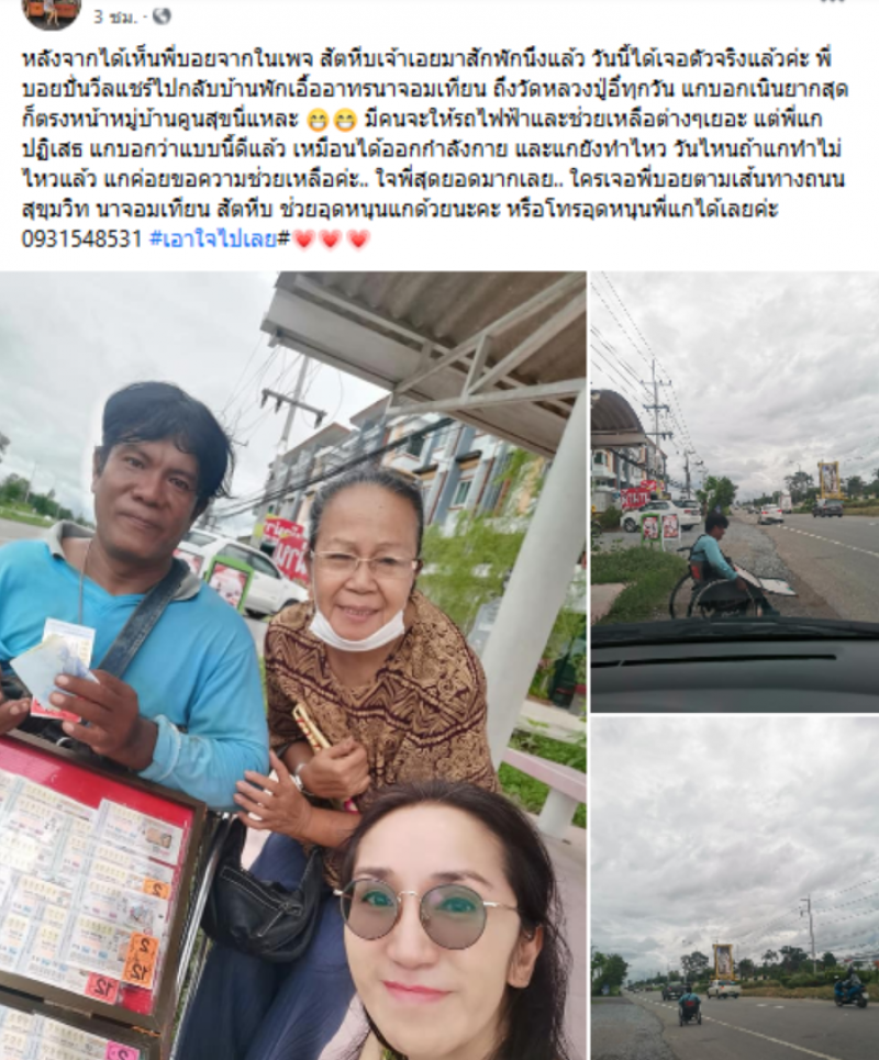 โดยผู้โพสต์ได้ระบุว่า หลังจากได้เห็นพี่บอยจากในเพจ สัตหีบเจ้าเอยมาสักพักนึงแล้ว วันนี้ได้เจอตัวจริงแล้วค่ะ พี่บอยปั่นวีลแชร์ไปกลับบ้านพักเอื้ออาทรนาจอมเทียน ถึงวัดหลวงปู่อี๋ทุกวัน แกบอกเนินยากสุดก็ตรงหน้าหมู่บ้านคูนสุขนี่แหละ มีคนจะให้รถไฟฟ้าและช่วยเหลือต่างๆเยอะ แต่พี่แกปฏิเสธ แกบอกว่าแบบนี้ดีแล้ว เหมือนได้ออกกำลังกาย และแกยังทำไหว วันไหนถ้าแกทำไม่ไหวแล้ว แกค่อยขอความช่วยเหลือค่ะ ใจพี่สุดยอดมากเลย ใครเจอพี่บอยตามเส้นทางถนนสุขุมวิท นาจอมเทียน สัตหีบ ช่วยอุดหนุนแกด้วยนะคะ หรือโทรอุดหนุนพี่แกได้เลยค่ะ 0931548531 เอาใจไปเลย