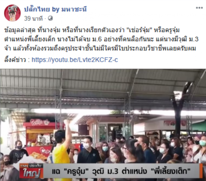 ล่าสุด เพจ ปลั๊กไทย by มหาชะนี ได้โพสต์ข้อความระบุว่า ข้อมูลล่าสุด ที่นางจุ๋ม หรือที่นางเรียกตัวเองว่า เช่อร์จุ๋ม หรือครูจุ๋ม ตำแหน่งพี่เลี้ยงเด็ก นางไม่ได้จบ ม.6 อย่างที่คนลือกันนะ แต่นางมีวุฒิ ม.3 จ้า แล้วทั้งห้องรวมถึงครูประจำชั้นไม่มีใครมีใบประกอบวิชาชีพเลยครับผม