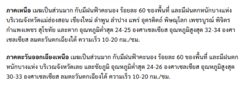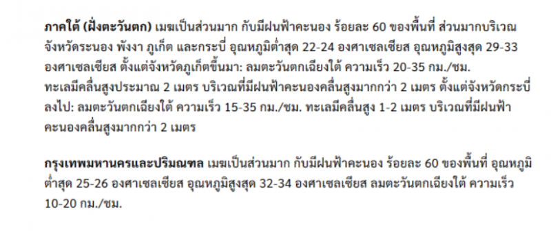 และอ่าวไทยมีกำลังปานกลาง ทำให้ประเทศไทยยังคงมีฝนตกต่อเนื่อง และมีฝนตกหนักบางแห่งบริเวณภาคเหนือ ภาคตะวันออกเฉียงเหนือ ภาคกลาง และภาคตะวันออก ขอให้ประชาชนที่อาศัยในพื้นในภาคเหนือ ภาคตะวันออก และภาคใต้ ระวังอันตรายจากฝนที่ตกหนักและฝนที่ตกสะสมไว้ด้วย สำหรับคลื่นลมบริเวณทะเลอันดามัน และอ่าวไทยมีกำลังปานกลาง โดยทะเลอันดามันตอนบนมีคลื่นสูงประมาณ 2 เมตร บริเวณอ่าวไทยตอนบนคลื่นสูง 1ถึง2 เมตร ส่วนบริเวณที่มีฝนฟ้าคะนองคลื่นสูงมากกว่า 2 เมตร ขอให้ชาวเรือควรเดินเรือด้วยความระมัดระวัง และควรหลีกเลี่ยงบริเวณที่มีฝนฟ้าคะนอง
