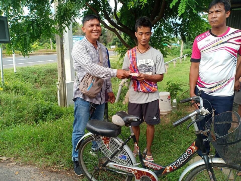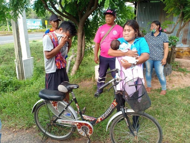 จากกรณี ที่มีผู้ใช้เฟซบุ๊กชื่อ โกโก้ กู้ภัย ศูนย์หนึ่ง ได้โพสต์เรื่องราวเมื่อวันที่ 28 ก.ย. 63 ว่าช่วงเวลาประมาณ 15:15 น ได้รับแจ้ง จากพลเมืองดีมีผู้พบเห็นชายวัยรุ่น หอบลูกน้อยปั่นจักรยานริมถนนสุรินทร์- บุรีรัมย์ โดยใช้ผ้าขาวม้ามัดลูกติดกับหน้าอก ซึ่งพลเมืองดีที่พบเห็นเกรงว่าจะเกิดอันตราย จึงแจ้ง ไปทางหน่วยกู้ชีพกู้ภัยสุรินทร์ เพื่อให้ลงพื้นที่มาตรวจสอบ จากการสอบถาม ของเจ้าหน้าที่เบื้องต้น ทราบว่า ชายวัยรุ่นคนดังกล่าวได้หอบลูกน้อย วัยเพียง 2 เดือน ปั่นรถจักรยานมุ่งหน้าไปยังอำเภอกระสัง จังหวัดบุรีรัมย์ ระยะทางร่วมๆ 30 กิโลเมตร เพื่อที่จะตามง้อภรรยา ที่ได้ทะเลาะกันก่อนหน้านี้ และเนื่องด้วย ต้นค่อนข้างมีฐานะยากจน ไม่มีเงิน จึงตัดสินใจพาลูกน้อยปั่นจักรยาน