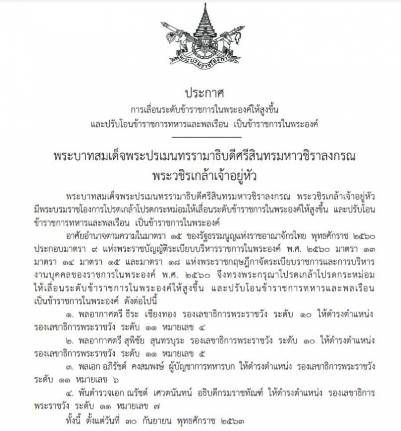 เว็บไซต์ ราชกิจจานุเบกษา ประกาศ การเลื่อนระดับข้าราชการในพระองค์ให้สูงขึ้น และปรับโอนข้าราชการทหารและพลเรือน เป็นข้าราชการในพระองค์