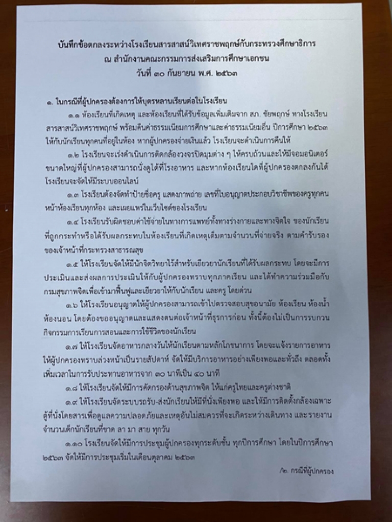เริ่มเห็นทางออก ร.ร.สารสาสน์ เปิดบันทึกข้อตกลง เยียวยานักเรียน-ผู้ปกครอง