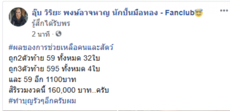 เมื่อวันที่ 1 ตุลาคม 63 เพจ อุ๊บ วิริยะ พงษ์อาจหาญ นักปั้นมือทอง Fanclub ได้โพสต์ข้อความระบุว่าผลของการช่วยเหลือคนและสัตว์ ถูก2ตัวท้าย 59 ทั้งหมด 32ใบ ถูก3ตัวท้าย 595 ทั้งหมด 4ใบ และ 59 อีก 1100บาท สิริรวมงวดนี้ 160,000 บาทครับ ทำบุญรัวๆอีกครับผม