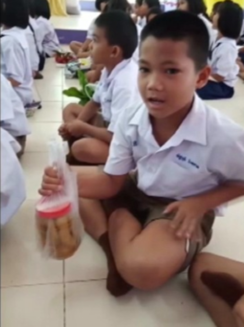ขณะที่เด็กนักเรียนที่นำเอาของฝากมามอบให้กับ ผอ.ร.ร.กล่าวว่า ตนกับพ่อไปหาเก็บหมากผีผ่วน มาจากในป่า เพื่อต้องการให้ ผอ.ร.ร.ได้กินผลไม้ป่าจะได้มีสุขภาพแข็งแรง ส่วนปลาดุกหาจับมาได้จากสระในหมู่บ้าน มะขามดอง ทำเองที่บ้านเพราะว่า พ่อแม่ทำมะขามดองขายในหมู่บ้านรสชาติอร่อยเปรี้ยวมาก อยากให้ ผอ.ร.ร.ได้กินผลไม้ที่ดีมีคุณภาพจะได้มีสุขภาพแข็งแรง