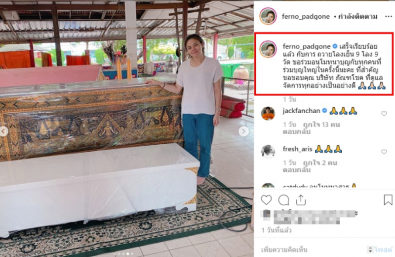 เเละล่าสุด สาวใบเฟิร์น ก็ได้โพสต์รูปภาพลงไอจี ขณะที่ตนเองนั้นได้มาทำบุญทั้งหมด 9 วัด โดย สาวใบเฟิร์น ได้ระบุข้อความว่า เสร็จเรียบร้อยแล้ว กับการทำบุญ 9 วัด ขอร่วมอนุโมทนาบุญกับทุกคนที่ร่วมบุญใหญ่ในครั้งนี้นะคะ