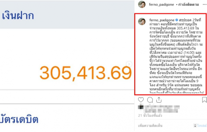 เเละก่อนหน้านี้ ก็นับว่าเป็นเรื่องราวดีๆ เมื่อ สาวใบเฟิร์น นั้นได้โพสต์รูปภาพลงบนอินสตราเเกรม ขอบริจาคทำบุญทำบุญร่วมกัน เนื่องในวันอายุครบ 30 ปีบริบูรณ์ ซึ่งงานนี้ สาวใบเฟิร์น นั้นได้โพสต์ระบุข้อความว่า วันเกิดปีนี้ เฟินตั้งใจทำบุญ บริจาคให้กับวัดโพธาราม จังหวัดราชบุรี