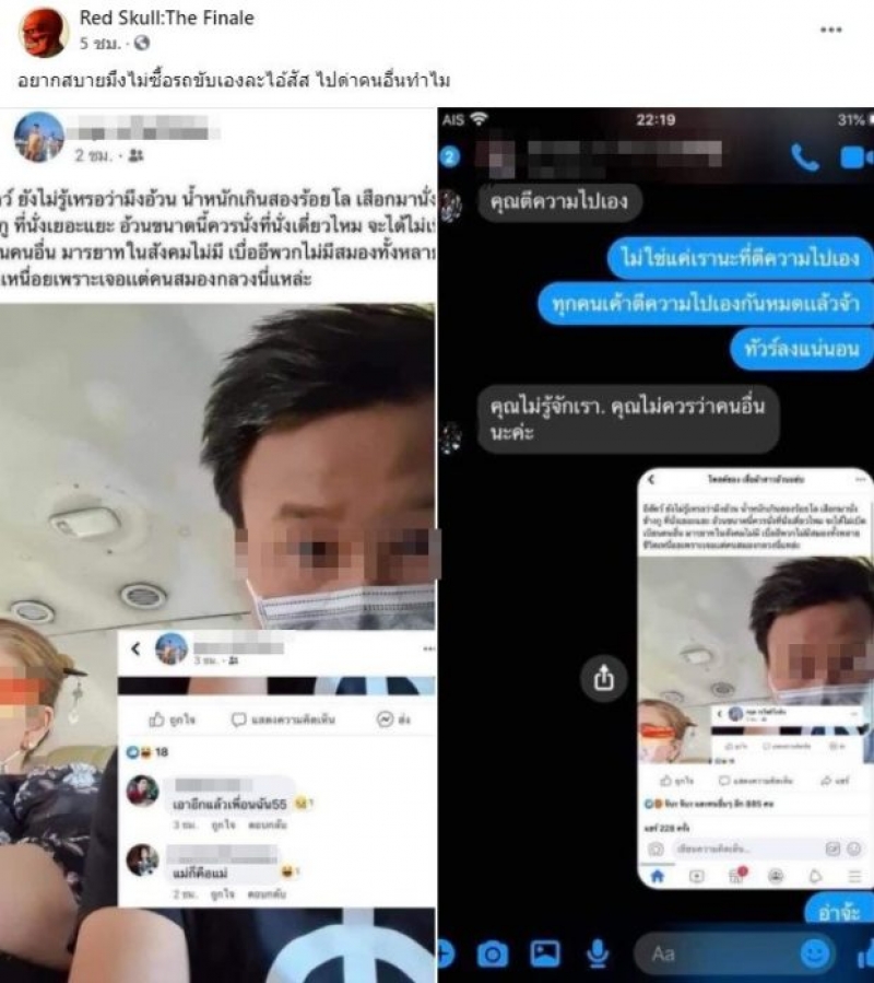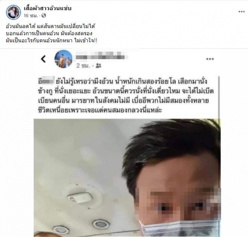 รู้หรือว่าตัวเองอ้วน น้ำหนักเกินสองร้อยโล มานั่งข้างตนเองทำไมที่นั่งที่อื่นเยอะแยะ อ้วนขนาดนนี้ควรนั่งที่เดี่ยวหรือไม่ จะได้ไม่เบียดคนอื่น พร้อมยังด่าด้วยความรุนแรงว่า สาวรายนี้ไม่มีมารยาท ไม่มีสมอง โดยมีเพื่อนเข้ามาคอมเมนต์ด้วยความขำขัน