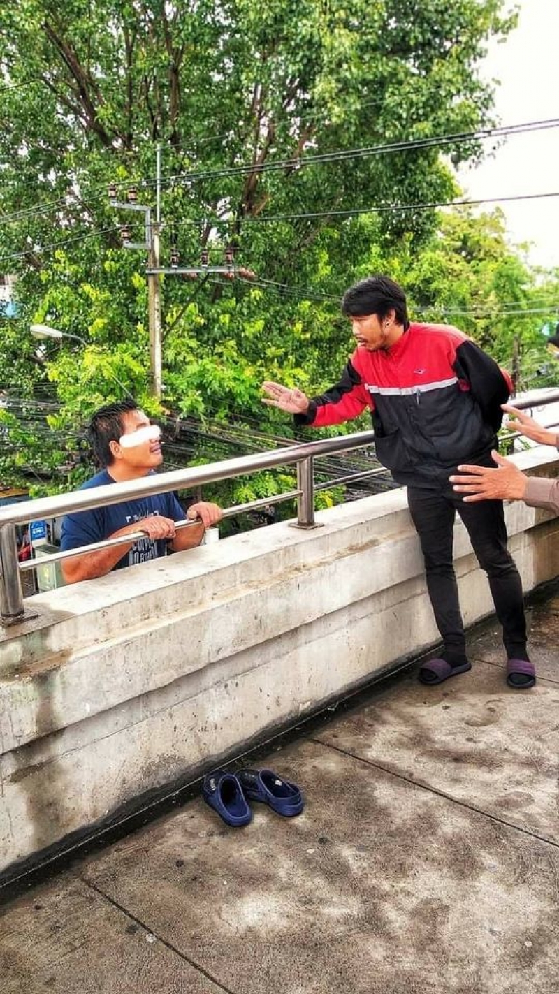 สรุปให้ฟังนะครับ เรื่องมีอยู่ว่าพี่คนนี้เค้าจะกระโดดสะพานลอย ดีที่ผมไปเห็นพอดี ไม่มีใครขึ้นไปช่วยเลย ข้างล่างก็มีคนตะโกน โดดเลยๆ ผมก็กลัวเค้ากระโดดจริงๆ เลยขึ้นไปคุยกับพี่เค้า พี่เค้าบอกว่า เมียพี่เคาทิ้ง แล้วเอาเงินพี่เค้าไปด้วยทั้งหมด 4,500 เค้าทำงานมาทั้งเดือนเพื่อจะเอาเงินนี้ไปหาหมอรักษาอาการลมชัก แล้วเงินที่เหลือจะเอาไปให้พ่อแม่เค้า แต่เมียเค้าเอาไปหมดเลย เค้าเลยท้อแล้วหมดกำลังใจ เลยไปกินเหล้า ปกติเค้าบอกว่าเค้าไม่เคยกิน แต่ครั้งนี้เครียดมาก เลยกินไปแล้วเรื่องก็เลยเป็นแบบนี้ ตอนนี้ก็ได้พี่บิณ ดูแลเรื่องค่าใช้จ่ายในการรักษาพยาบาลทั้งหมดนะครับ นำไปรักษาที่โรงพยาบาลนครปฐมครับ