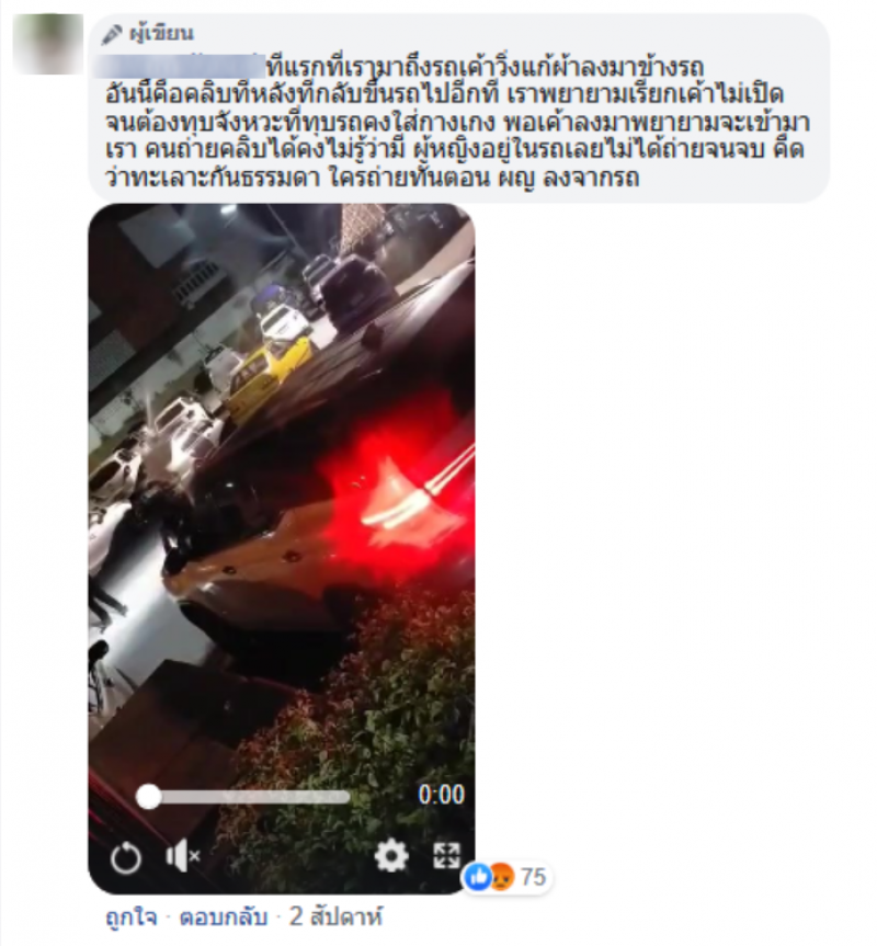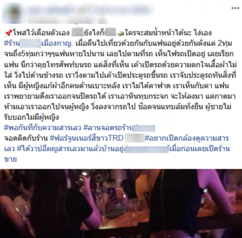 โดยสาวรายนี้ได้โพสต์ว่า โพสไว้เตือนตัวเอง .....ยังไงก็....ใครจะสมน้ำหน้าได้นะ โง่เอง ร้าน.......เมืองกาญ เมื่อคืนไปเที่ยวด้วยกันกับแฟนอยู่ด้วยกันตั่งแต่ 2ทุ่ม จนถึง5ทุ่มกว่าๆๆแฟนหายไปนาน เลยไปตามที่รถ เห็นไฟรถเปิดอยู่ เลยเรียกแฟน นึกว่าคุยโทรศัพท์บนรถ แต่สิ่งที่เห็น เค้าเปิดรถด้วยความตกใจเสื้อผ้าไม่ใส่ วิ่งไปด้านข้างรถ เราวิ่งตามไปเค้าเปิดประตูรถขึ้นรถ เราจับประตูรถทันสิ่งที่เห็น มีผู้หญิงแก้ผ้าอีกคนด้านเบาะหลัง เราไม่ได้ตาฟาด เราเห็นกับตา แฟนเราพยายามดึงเราออกจนปิดรถได้ เราเอาหินทุบกระจก จะให้ลงมา แต่กาดมาห้ามเอาเราออกไปจนผู้หญิง วิ่งลงจากรถไป ช๊อคจนแทบล้มทั่งยืน ผู้ชายไม่รับบอกไม่มีผู้หญิง