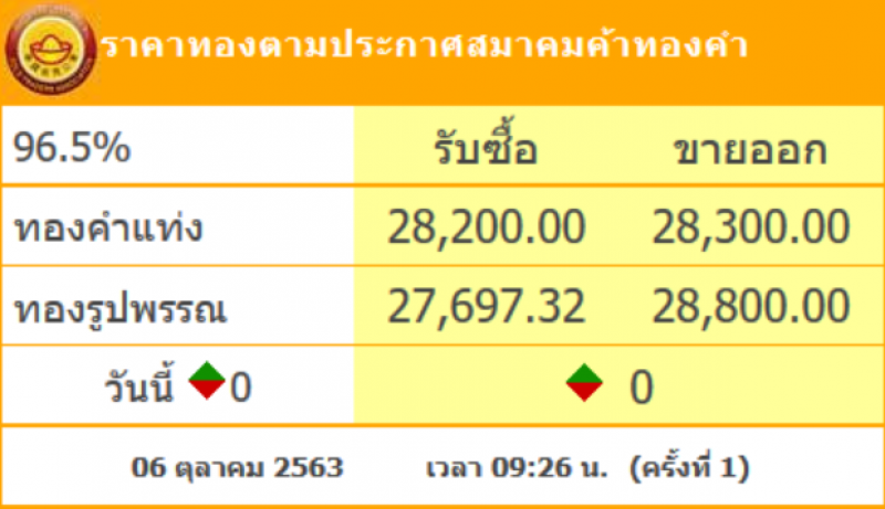 วันที่ 6 ตุลาคม 2563 ผู้สื่อข่าวรายงานว่า สมาคมค้าทองคำรายงาน ราคาทองไทย ครั้งที่ 1 เมื่อเวลา 09.26 น. โดยราคาทองล่าสุดวันนี้ เปิดตลาดเช้าราคายังคงที่ โดยทองคำแท่ง รับซื้อบาทละ 28,200 ขายออกบาทละ 28,300 บาท ส่วนทองรูปพรรณ รับซื้อบาทละ 27,697.32 ขายออกบาทละ 28,800 บาท
