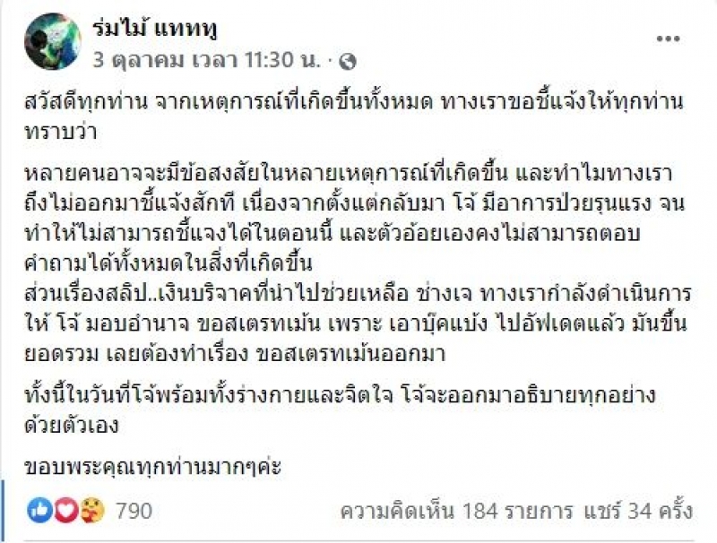 และตัวอ้อยเองคงไม่สามารถตอบคำถามได้ทั้งหมดในสิ่งที่เกิดขึ้น ส่วนเรื่องสลิป..เงินบริจาคที่นำไปช่วยเหลือ ช่างเจ ทางเรากำลังดำเนินการให้ โจ้ มอบอำนาจ ขอสเตรทเม้น เพราะ เอาบุ๊คแบ้ง ไปอัฟเดตแล้ว มันขึ้นยอดรวม เลยต้องทำเรื่อง ขอสเตรทเม้นออกมา ทั้งนี้ในวันที่โจ้พร้อมทั้งร่างกายและจิตใจ โจ้จะออกมาอธิบายทุกอย่างด้วยตัวเอง ขอบพระคุณทุกท่านมากๆค่ะ