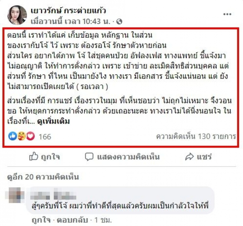 ทั้งนี้ เวลาที่โจ้ จะรักษาตัวนานแค่ไหนนั้น ทางแพทย์ ก็ไม่สามารถระบุได้ค่ะ แต่ขอกราบเรียนไว้ว่า ถ้าโจ้ ดีขึ้น ร่างกาย กลับมา เป็นปกติ และ สภาพจิตใจ แข็งแรง เมื่อไร ทางเรา พร้อมโจ้ จะออกมา ขอโทษ และ ชี้แจง รายละเอียด ทุกอย่างแน่นอน ค่ะ ขอความกรุณาด้วยนะคะ อีกด้วย