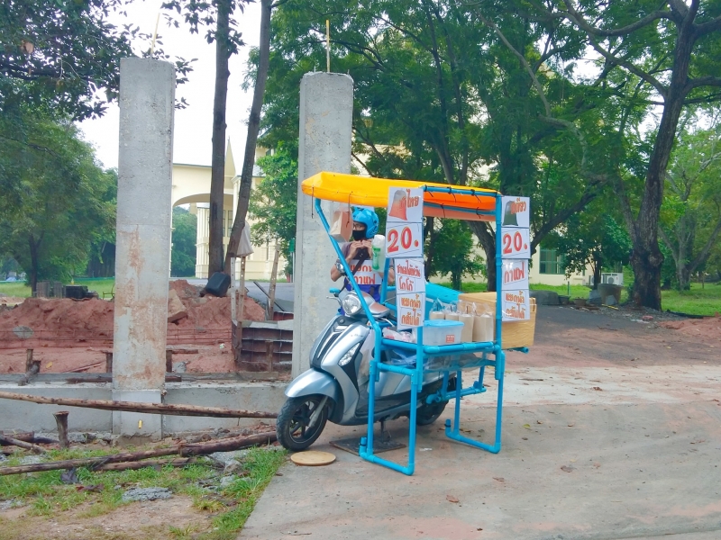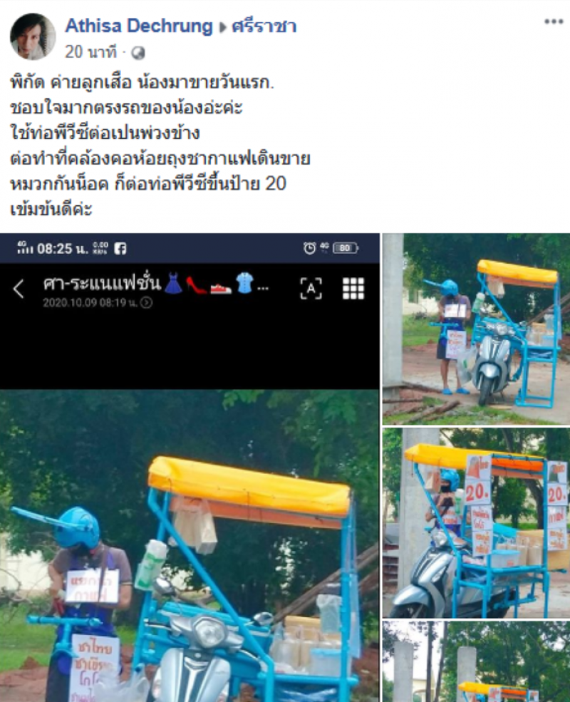 โดยผู้โพสต์ระบุว่า พิกัด ค่ายลูกเสือ น้องมาขายวันแรก. ชอบใจมากตรงรถของน้องอ่ะค่ะ ใช้ท่อพีวีซีต่อเปนพ่วงข้าง ต่อทำที่คล้องคอห้อยถุงชากาแฟเดินขาย หมวกกันน็อค ก็ต่อท่อพีวีซีขึ้นป้าย 20 เข้มข้นดีค่ะ