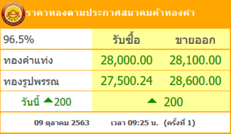 วันที่ 9 ตุลาคม 2563 ผู้สื่อข่าวรายงานว่า สมาคมค้าทองคำรายงาน ราคาทองไทย ครั้งที่ 1 เมื่อเวลา 09.2ถ น. โดยราคาทองล่าสุดวันนี้ เปิดตลาดเช้าราคาได้มีการปรับขึ้น 200 บาท โดยทองคำแท่ง รับซื้อบาทละ 28,000 ขายออกบาทละ 28,100 บาท ส่วนทองรูปพรรณ รับซื้อบาทละ 27,500.24 ขายออกบาทละ 28,600 บาท