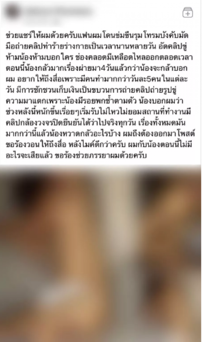 ช่วยแชร์ให้ผมด้วยครับ แฟนผมโดนข่มขืน รุมโทรมบังคับมัดมือถ่ายคลิปทำร้ายร่างกายเป็นเวลานานหลายวัน อัดคลิปขู่ห้ามบอกใคร ช่องคลอดมีเหลือดไหลออกตลอดเวลา ตอนนี้น้องกลัวมากเรื่องผ่านมา 4 วันแล้วกว่าน้องจะกล้าบอกผม อยากให้ถึงสื่อเพราะมีคนทำมากกว่าวันละ 5 คน ในแต่ละวัน มีการชักชวนเก็บเงินเป็นขบวนการถ่ายคลิป ถ่ายรูปขู่