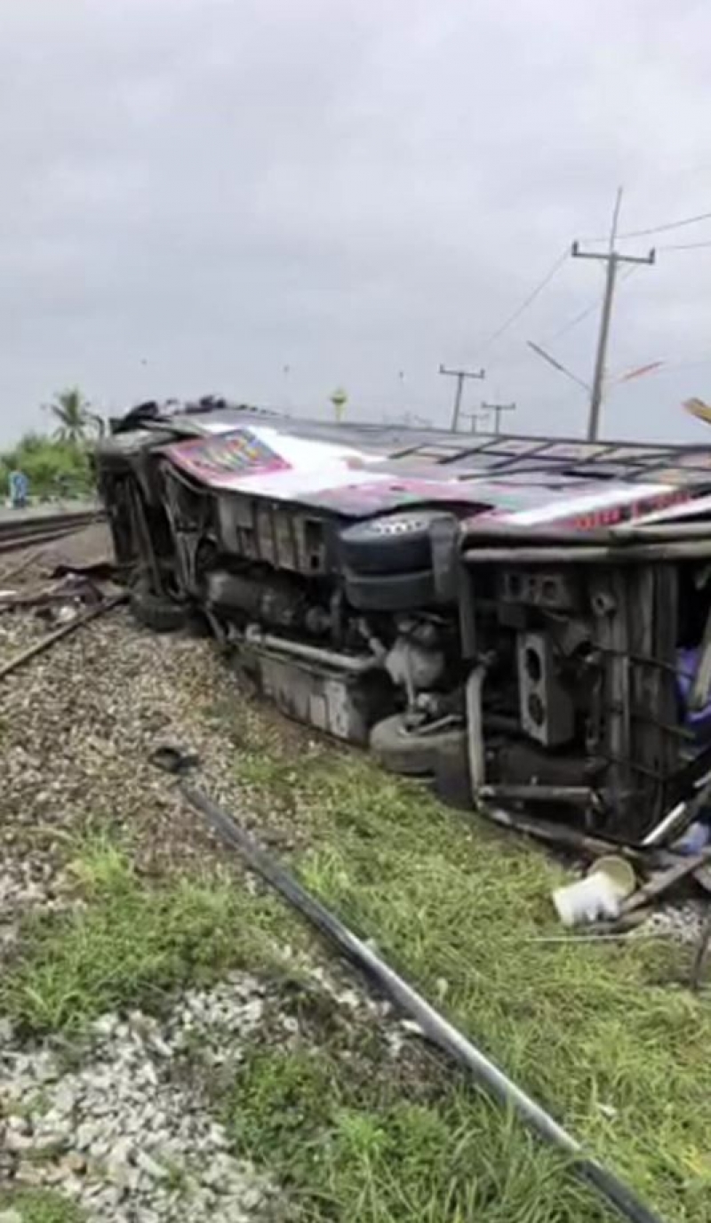 ทั้งนี้บริเวณจุดเกิดเหตุไม่มีไม้กั้น และรถไฟเปิดหวูดเตือนแล้ว แต่รถบัสไม่ได้ยินสัญญาณ จนเกิดการชนประสานงากันเกิดขึ้น คาดว่าคนขับรถบัสคงไม่ชำนาญเส้นทาง ซึ่งจุดดังกล่าวเป็นสถานีรถไฟย่อย (รถไฟไม่จอด) เลยไม่มีสัญญาณไฟ ไม่มีที่กั้น เเละล่าสุดมีรายงานเบื้องต้น ว่า มีผู้เสียชีวิตเเล้วมากกว่า 20ราย เเละมีผู้บาดเจ็บ 29 ราย ซึ่งทีมกู้ภัยเร่งนำผู้ที่ได้รับบาดเจ็บนำส่งโรงพยาบาลพุทธโสธร และ รพ.บ้านโพธิ์ นอกจากนี้วัดจุดหมายปลายทางของคณะทำบุญทอดกฐิน อยู่ห่างจากจุดเกิดอุบัติเหตุเเค่ 5กม.เท่านั้น