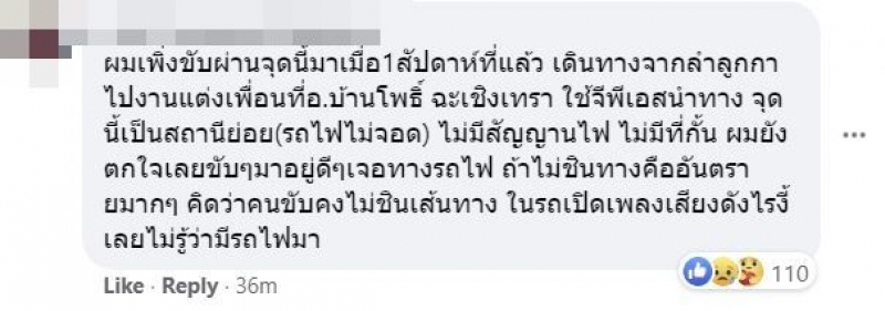 ด้านชาวเน็ตรายหนึ่งเผย ว่า ผมเพิ่งขับผ่านจุดนี้มาเมื่อ1สัปดาห์ที่แล้ว เดินทางจากลำลูกกาไปงานแต่งเพื่อนที่อ.บ้านโพธิ์ ฉะเชิงเทรา ใช้จีพีเอสนำทาง จุดนี้เป็นสถานีย่อย(รถไฟไม่จอด) ไม่มีสัญญานไฟ ไม่มีที่กั้น ผมยังตกใจเลยขับๆมาอยู่ดีๆเจอทางรถไฟ ถ้าไม่ชินทางคืออันตรายมากๆ คิดว่าคนขับคงไม่ชินเส้นทาง ในรถเปิดเพลงเสียงดังไรงี้ เลยไม่รู้ว่ามีรถไฟมา