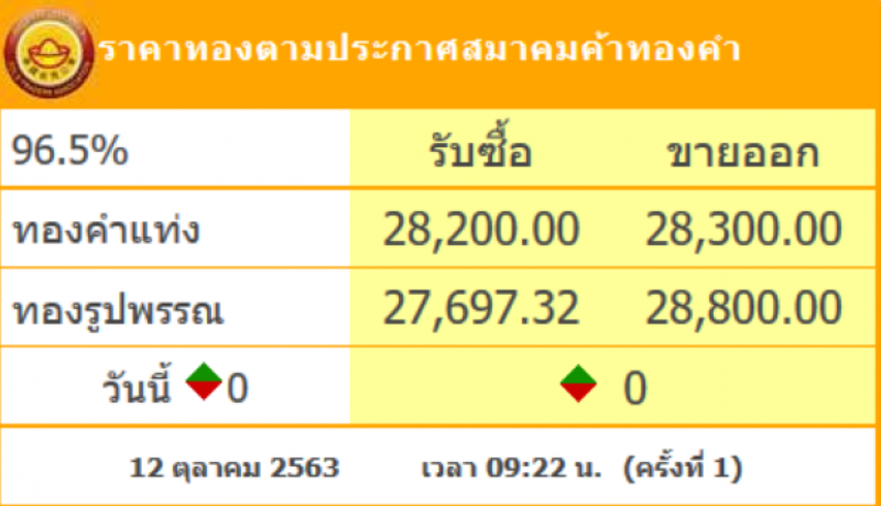 วันที่ 12 ตุลาคม 2563 ผู้สื่อข่าวรายงานว่า สมาคมค้าทองคำรายงาน ราคาทองไทย ครั้งที่ 1 เมื่อเวลา 09.22 น. โดยราคาทองล่าสุดวันนี้ เปิดตลาดเช้าราคายังคงที่จากเดิมที่ได้ปรับขึ้นมาเล็กน้อย โดยทองคำแท่ง รับซื้อบาทละ 28,200 ขายออกบาทละ 28,300 บาท ส่วนทองรูปพรรณ รับซื้อบาทละ 27,697.32 ขายออกบาทละ 28,800 บาท