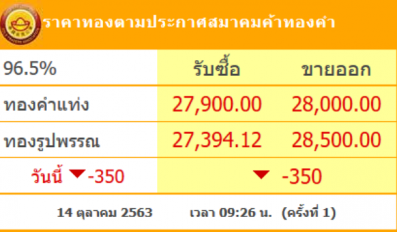 วันที่ 14 ตุลาคม 2563 ผู้สื่อข่าวรายงานว่า สมาคมค้าทองคำรายงาน ราคาทองไทย ครั้งที่ 1 เมื่อเวลา 09.26 น. โดยราคาทองล่าสุดวันนี้ เปิดตลาดเช้าราคาได้มีการปรับลดลงมา 350 บาท โดยทองคำแท่ง รับซื้อบาทละ 27,900 ขายออกบาทละ 28,000 บาท ส่วนทองรูปพรรณ รับซื้อบาทละ 27,394.12 ขายออกบาทละ 28,500 บาท