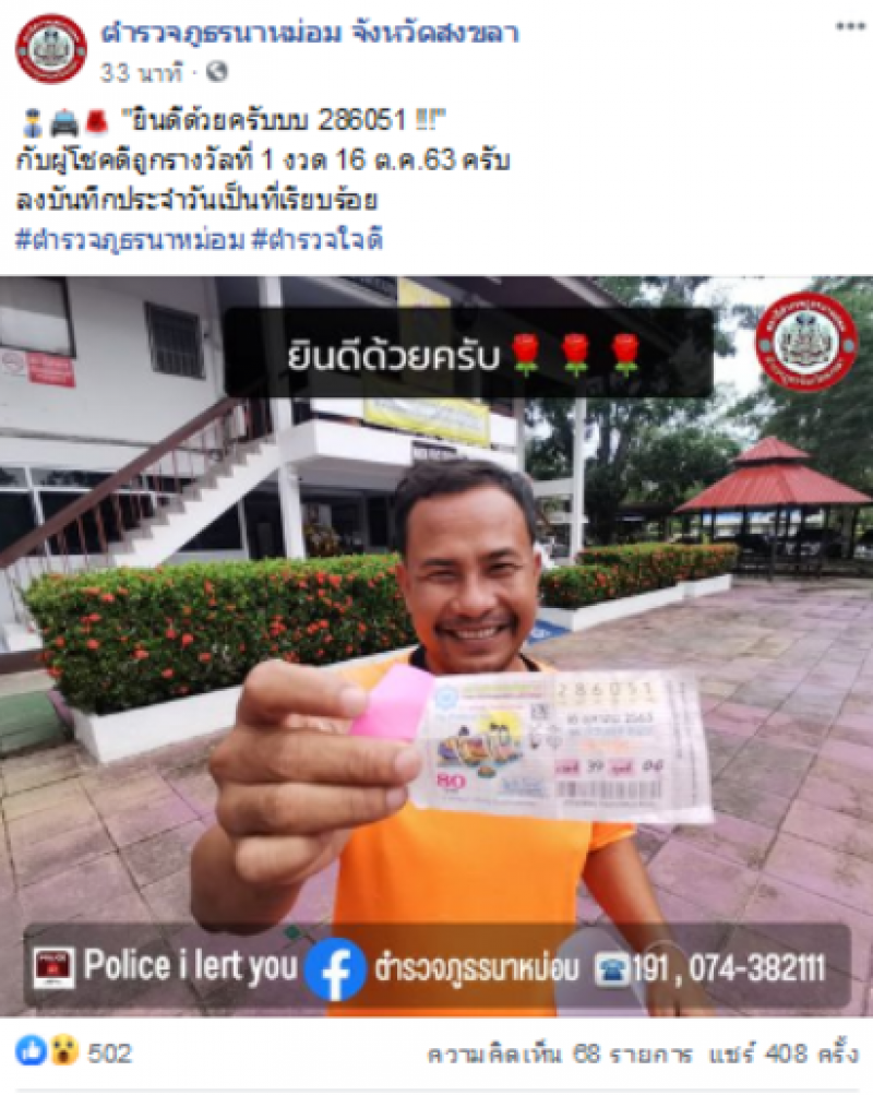 ล่าสุดเพจ ตำรวจภูธรนาหม่อม จังหวัดสงขลา ได้ออกมาดพสต์ภาพหนุ่ม ถูกรางวัลที่ 1 พร้อมทั้งได้ระบุข้อความว่า ยินดีด้วยครับบบ 286051 กับผู้ ถูกรางวัลที่ 1 16 ต.ค.63 ครับ ลงบันทึกประจำวันเป็นที่เรียบร้อย