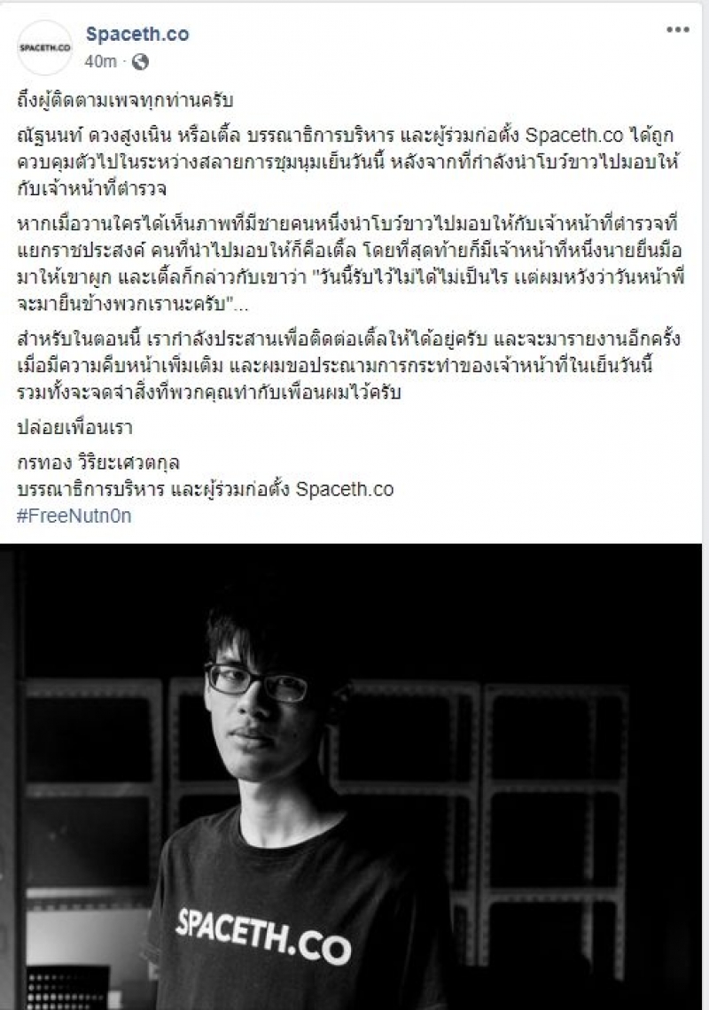 ทางเพจแจ้งว่า ถึงผู้ติดตามเพจทุกท่านครับ ณัฐนนท์ ดวงสูงเนิน หรือเติ้ล บรรณาธิการบริหาร และผู้ร่วมก่อตั้ง Spaceth.co ได้ถูกควบคุมตัวไปในระหว่างสลายการชุมนุมเย็นวันนี้ หลังจากที่กำลังนำโบว์ขาวไปมอบให้กับเจ้าหน้าที่ตำรวจ