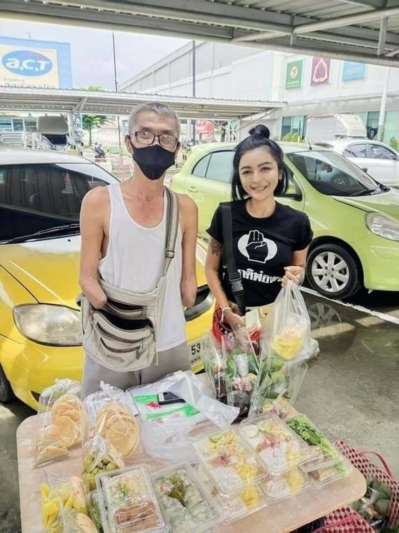 ซึ่งทางผู้ใช้เฟซบุ๊กรายนี้ได้โพสต์ภาพพร้อมด้วยข้อความระบุว่า ขอกำลังใจให้คุณลุงหน่อยค่ะ วันนี้มาเดินโลตัส คลอง 2 ลำลูกกา ได้เจอคุณลุงแขนพิการทั้งสองข้างมายืนขายขนมตรงทางเข้าห้าง คุณลุงไม่มีมือนะคะ แต่ก็ยังมาขายขนมที่หน้าโลตัสนี้เป็นประจำ วันนี้เลยอุดหนุนคุณลุง 3 ถุง ร้อยเดียวเอง แบ่งปันกันไป แถมเราได้ขนมอร่อยๆ มากินด้วย