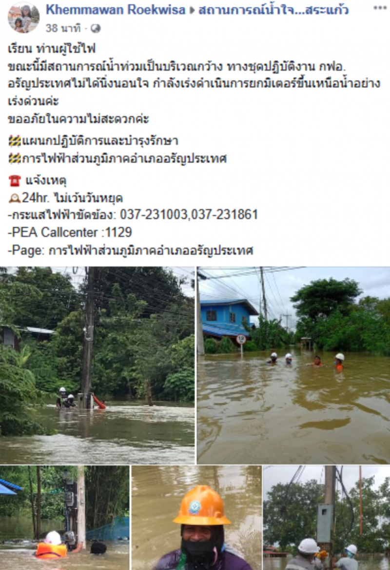 ล่าสุดในโซเชียล ได้มีการชื่นชม เจ้าหน้าที่ กฟภ.อรัญประเทศ หลังจากที่ผู้ใช้เฟซบุ๊ก ได้โพสต์ลงกลุ่มระบุว่า เรียน ท่านผู้ใช้ไฟ ขณะนี้มีสถานการณ์น้ำท่วมเป็นบริเวณกว้าง ทางชุดปฏิบัติงาน กฟอ. อรัญประเทศไม่ได้นิ่งนอนใจ กำลังเร่งดำเนินการยกมิเตอร์ขึ้นเหนือน้ำอย่างเร่งด่วนค่ะ ขออภัยในความไม่สะดวกค่ะ