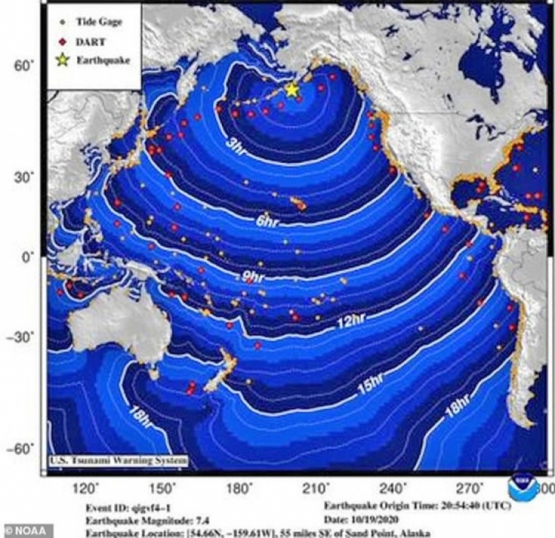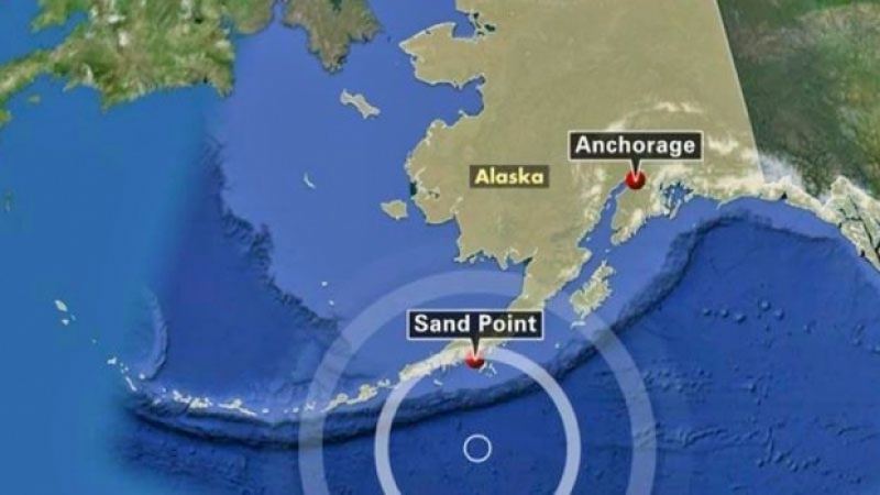 และห่างจากเมืองแซนด์ฮิลล์ไปทางตะวันออกเฉียงใต้ราว 90 กิโลเมตร ส่งผลให้ศูนย์เตือนภัยสึนามิแห่งชาติประกาศเฝ้าระวังบริเวณอ่าวตลอดแนวชายฝั่งรัฐอลาสกาเป็นระยะทางกว่า 800 กิโลเมตร