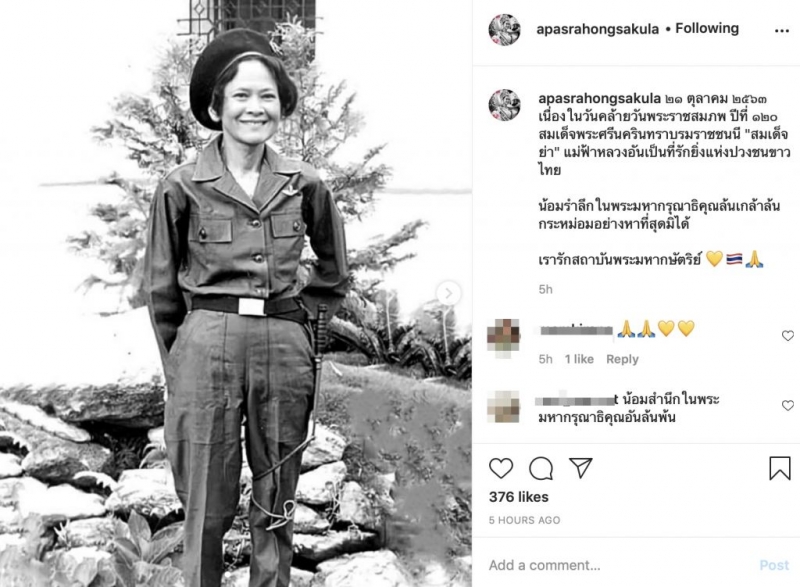 ล่าสุดทางด้านนางสาวไทยและนางงามจักรวาลในตำนานอย่าง ปุ๊ก อาภัสรา หงสกุล ได้ออกมาโพสต์ข้อความแสดงจุดยืนว่า ๒๑ ตุลาคม ๒๕๖๓ เนื่องในวันคล้ายวันพระราชสมภพ ปีที่ ๑๒๐ สมเด็จพระศรีนครินทราบรมราชชนนี "สมเด็จย่า" แม่ฟ้าหลวงอันเป็นที่รักยิ่งแห่งปวงชนขาวไทย น้อมรำลึกในพระมหากรุณาธิคุณล้นเกล้าล้นกระหม่อมอย่างหาที่สุดมิได้ เรารักสถาบันพระมหากษัตริย์