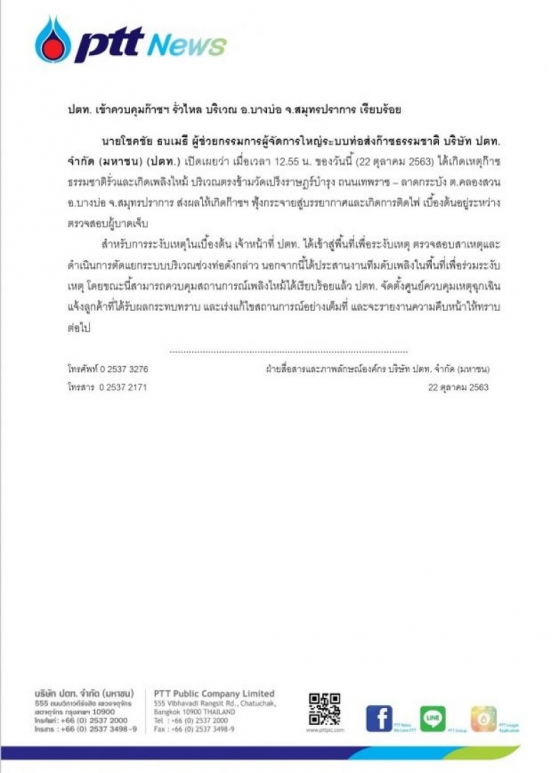 ปตท.ออกแถลง หลังเกิดเหตุท่อแก๊สระเบิด มีผู้บาดเจ็บและเสียชีวิต