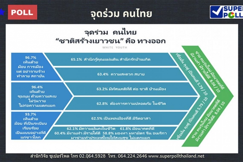 เมื่อวันที่ 24 ต.ค.2563 สำนักวิจัยซูเปอร์โพล (SUPER POLL) เปิดเผยผลสำรวจภาคสนาม เรื่องจุดร่วม คนไทย กรณีศึกษาประชาชนทุกสาขาอาชีพทั่วประเทศ 3,135 ตัวอย่าง ดำเนินโครงการระหว่าง 18-23 ต.ค. ที่ผ่านมา เมื่อถามความเห็นของประชาชนต่อม็อบเยาวชน พบว่า ส่วนใหญ่หรือร้อยละ 96.7 ระบุว่า ควรจะชุมนุมเรียกร้องเฉพาะเรื่องการเมือง อย่าจาบจ้วงล่วงละเมิดสถาบัน