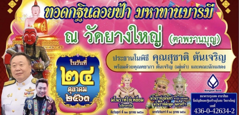 วันที่ 24 ตุลาคม 2563 พิธีกรชื่อดัง มดดํา คชาภา พร้อมทั้งคุณพ่อท่าน สุชาติ ตันเจริญ รองประธานสภาผู้แทนราษฎร ได้เดินทางไปเป็นประธานในพิธี ในบุญทอดกฐินลอยฟ้ามหาทานบารมี ที่วัดยางใหญ่ (ตาพรานบุญ) จังหวัดนครศรีธรรมราช โดยมีเพื่อนๆและทีมนักแสดงรวมไปถึง ดีเจบุ๊คโกะ ร่วมเดินทางไปทำบุญใหญ่ในครั้งนี้ด้วย