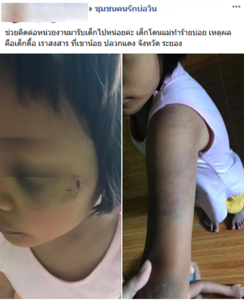 เรียกได้ว่าเป็นอีกหนึ่งเรื่องราวที่ถูกวิพากษ์วิจารณ์เป็นอย่างมาก หลังจากที่มีผู้ใช้เฟซบุ๊ก ซึ่งเป็นพลเมืองดีรายหนึ่ง ได้ลงเรื่องราวสุดน่าสงสาร ลงในกลุ่มชุมชนคนรักบ่อวิน เพื่อขอความช่วยเหลือ โดยเป็นภาพของเด็กหญิงที่ตามร่างกายมีรอยฟกช้ำ จากการถูกทำร้าย ซึ่งผู้โพสต์ระบุว่า ช่วยติดต่อหน่วยงานมารับเด็กไปหน่อยค่ะ เด็กโดนแม่ทำร้ายบ่อย เหตุผลคือเด็กดื้อ เราสงสาร ที่เขาน้อย ปลวกแดง จังหวัด ระยอง ซึ่งหลังจากที่ได้มีการโพสต์ภาพ ก็มีชาวโซเชียลเข้ามาแสดงความคิดเห็น ต่อว่าการกระทำของผู้เป็นแม่ ซึ่งทำเกินกว่าเหตุ เพราะการทำร้ายขนาดนี้ไม่ใส่สิ่งที่ดีในการสอนลูก มีแต่จะทำให้เด็กมีสภาพจิตใจแย่ลง และชาวโซเชียลก็ได้ช่วยกันแจ้งหน่วยงานต่างๆมาช่วยเหลือ