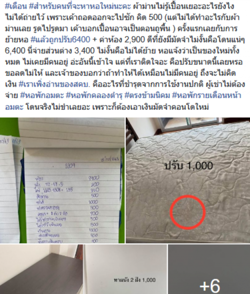โดยผู้โพสต์ระบุว่า เตือน สำหรับคนที่จะหาหอใหม่นะคะ ผ้าม่านไม่รู้เปื้อนเยอะอะไรยังไง ไม่ได้ถ่ายไว้ เพราะเค้าถอดออกจะไปซัก คิด 500 (แต่ไม่ได้ทำอะไรกับผ้าม่านเลย รูดไปรูดมา เค้าบอกเปื้อนอาจเป็นตอนถูพื้น ) ครั้งแรกเลยกับการย้ายหอ แล้วถูกปรับ6400 + ค่าห้อง 2,900 ดีที่ยังมีมัดจำไม่งั้นคือโดนแน่ๆ 6,400 นี่จ่ายส่วนต่าง 3,400 ไม่งั้นคือไม่ได้ย้าย หอแจ้งว่าเป็นของใหม่ทั้งหมด ไม่เคยมีคนอยู่ อ่ะอันนี้เข้าใจ แต่ที่เราติดใจอะ คือปรับขนาดนี้เลยหรอ ขอลดไม่ให้ และเจ้าของบอกว่าถ้าทำให้ได้เหมือนไม่มีคนอยู่ ถึงจะไม่คิดเงิน เราเพิ่งอ่านของสคบ. คืออะไรที่ชำรุดจากการใช้งานปกติ ผู้เช่าไม่ต้องจ่าย หอพักอมตะ หอพักคลองตำรุ ตรงข้ามนิคม หอพักรายเดือนหน้าอมตะ โดนจริงไม่ขำเลยอะ เพราะก็ต้องเอาเงินมัดจำคอนโดใหม่