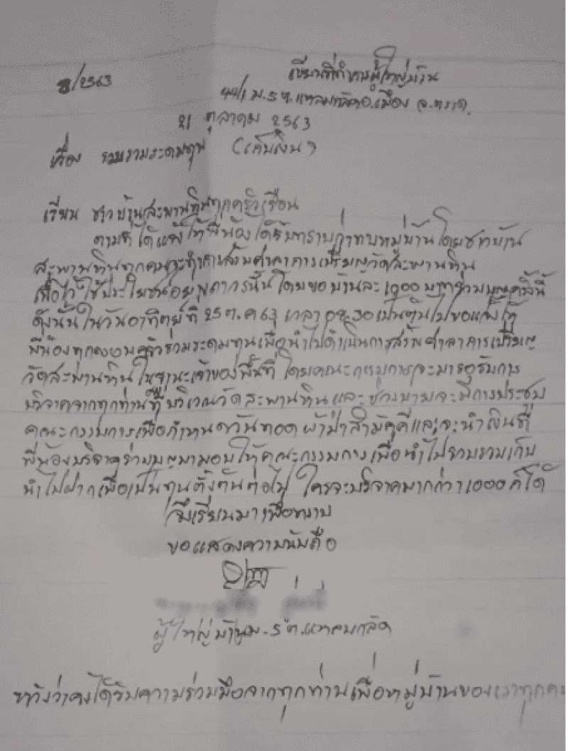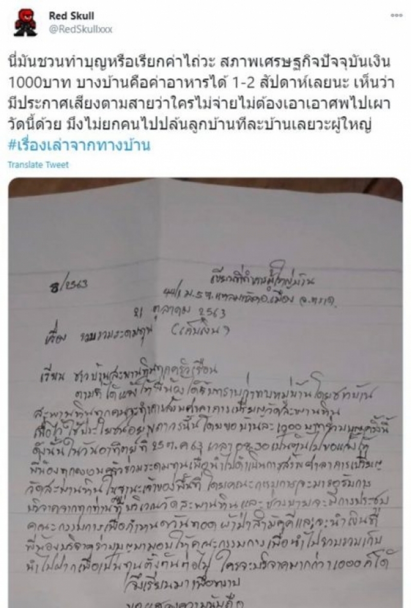 เพจเฟซบุ๊ก Red Skull:The Finale ได้เผยแพร่จดหมาย จากผู้ใหญ่บ้านแห้งหนึ่ง ใน จ. ตราด โดยมีใจความว่า จะมีการสร้างศาลาการเปรียญที่วัด จึงขอให้ลูกบ้านบริจาคบ้านละ 1,000 บาท หรือมากกว่านั้นก็ได้ พร้อมลงท้ายจดหมายว่า หวังว่าจะได้รับความร่วมมือจากทุกท่านเพื่อหมู่บ้านของเรา