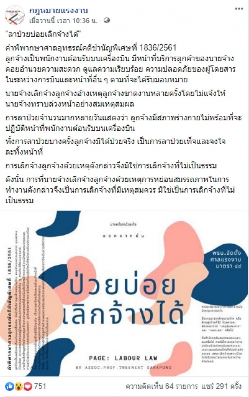 เรียกได้ว่าเป็นอีกหนึ่งเรื่องราวที่โซเชียลเข้ามาแสดงความเห็นกันเป็นจำนวนมาก หลังเพจ กฎหมายแรงงาน ได้โพสต์ภาพพร้อมข้อความเตือนลูกจ้างว่า "ลาป่วยบ่อยเลิกจ้างได้" คำพิพากษาศาลอุทธรณ์คดีชำนัญพิเศษที่ 1836/2561 ลูกจ้างเป็นพนักงานต้อนรับบนเครื่องบิน มีหน้าที่บริการลูกค้าของนายจ้าง คอยอำนวยความสะดวก ดูแลความเรียบร้อย ความปลอดภัยของผู้โดยสารในระหว่างการบินและหน้าที่อื่น ๆ ตามที่จะได้รับมอบหมาย