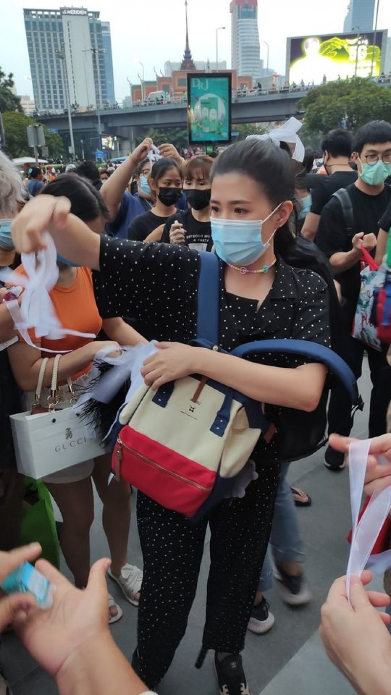 นางฟ้าราษฎร โฟกัส โผล่ร่วมม็อบเยาวชน นำริบบิ้นขาว มอบให้ผู้ชุมนุม