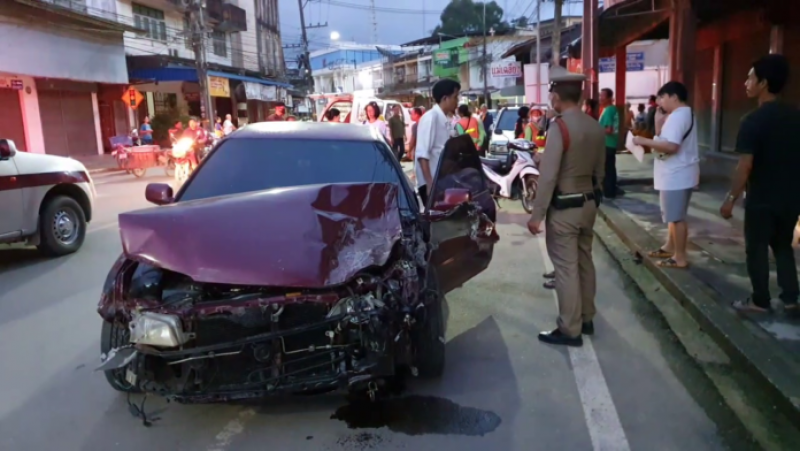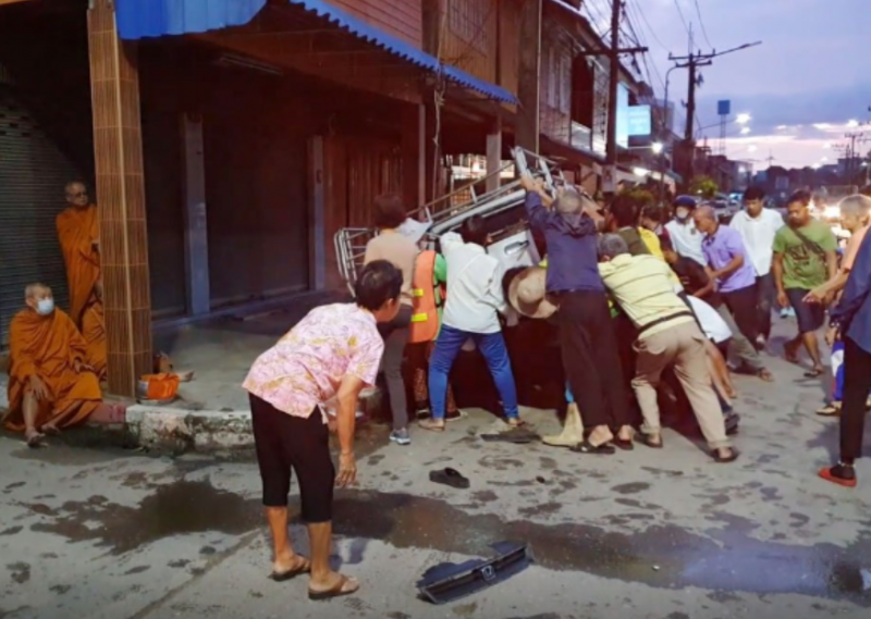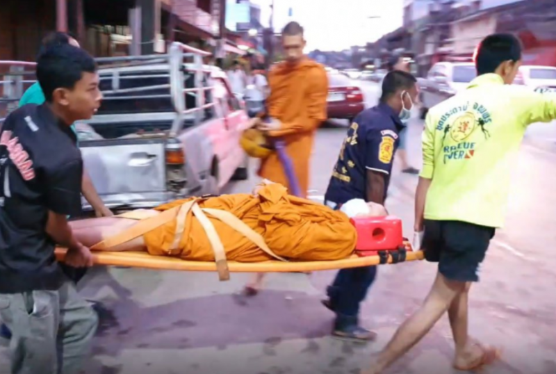 หนุ่มวูบซิ่งเก๋ง พุ่งชนพระกับโยมกระเด็น ขณะรับพรใส่บาตร