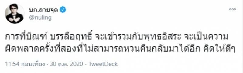 ในขณะเดียวกันทางด้าน "สมบัติ บุญงามอนงค์" หรือ "บก.ลายจุด" ได้ออกมาโพสต์ทวิตเตอร์ส่วนตัวถึงกรณีข้างต้น ในมุมเตือนบิณฑ์ ระบุว่า "การที่บิณฑ์ บรรลือฤทธิ์ จะเข้ารวมกับพุทธอิสระ จะเป็นความผิดพลาดครั้งที่สองที่ไม่สามารถหวนคืนกลับมาได้อีก คิดให้ดีๆ"