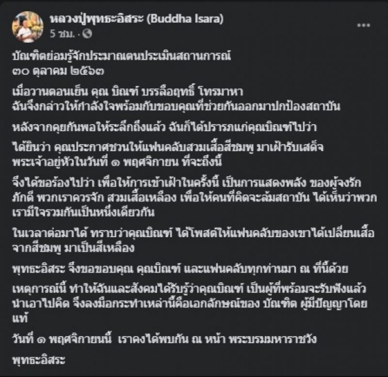 จากกรณีที่ "นายสุวิทย์ ทองประเสริฐ" หรือ "อดีตหลวงปู่พุทธะอิสระ" ได้เผยว่า วานนี้ 29 ต.ค. 63 ได้คุยกับ "บิณฑ์ บรรลือฤทธิ์" ก็ได้ให้กำลังใจพร้อมกับขอบคุณที่ช่วยกันออกมาปกป้องสถาบัน และขอร้องไปว่า เพื่อให้การเข้าเฝ้าในครั้งนี้ เป็นการแสดงพลัง ของผู้จงรัก ภักดี พวกเราควรจัก สวมเสื้อเหลือง เพื่อให้คนที่คิดจะล้มสถาบัน ได้เห็นว่าพวกเรามีใจรวมกันเป็นหนึ่งเดียวกัน ในเวลาต่อมาได้ บิณฑ์ ได้โพสต์ให้แฟนคลับของเขาได้เปลี่ยนเสื้อจากสีชมพู มาเป็นสีเหลือง